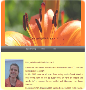 Ich möchte von meinen persönlichen Erlebnissen mit der OCG und der Familie Sasek berichten: Im März 2000 besuchte ich einen Besuchertag von Ivo Sasek. Was ich dort erlebte, kann ich nur so ausdrücken: Ich hörte die Predigt und wurde tief in meinem Herzen berührt und überzeugt von dieser Wahrheit. Da ich in meinem Glaubensleben stagnierte und wissen wollte wieso, nahm ich an einer Bemessung teil. In meinem Herzen erkannte ich welch ein eigenwilliger, individualistischer Mensch ich bin. Ich war darüber erschüttert und konnte umkehren.